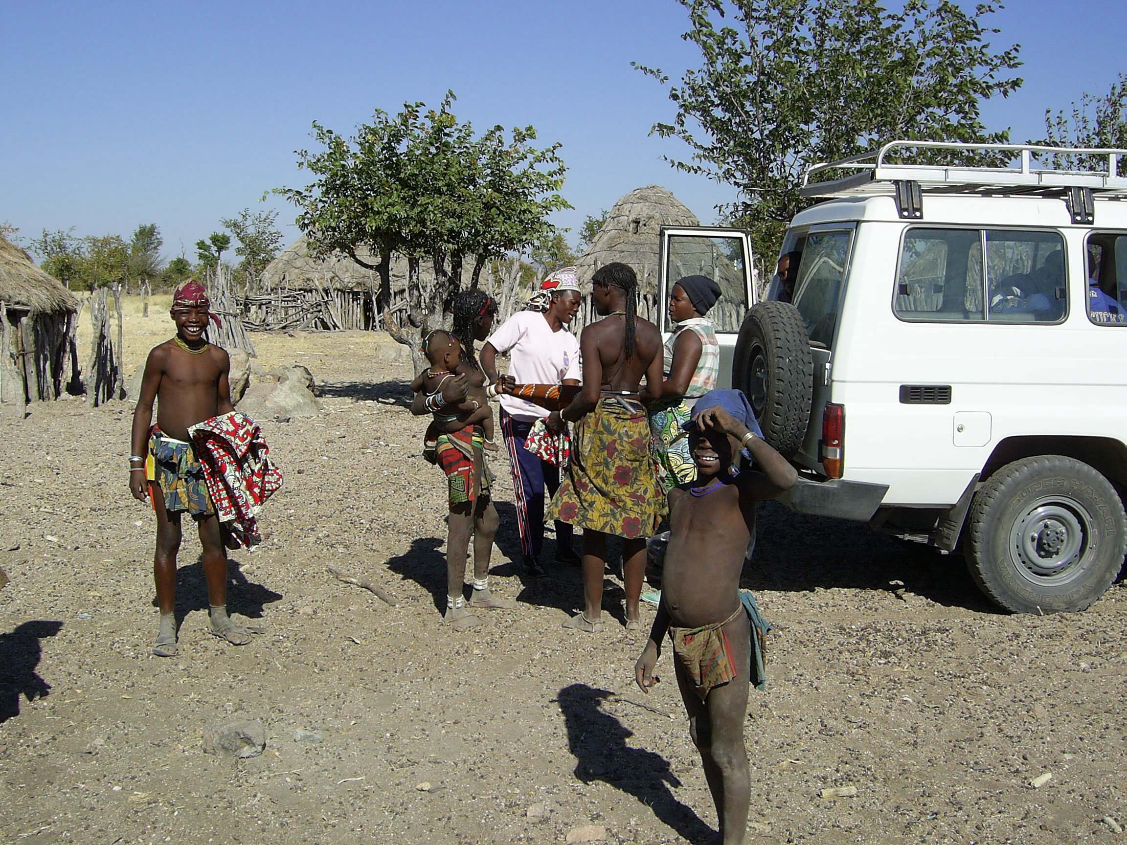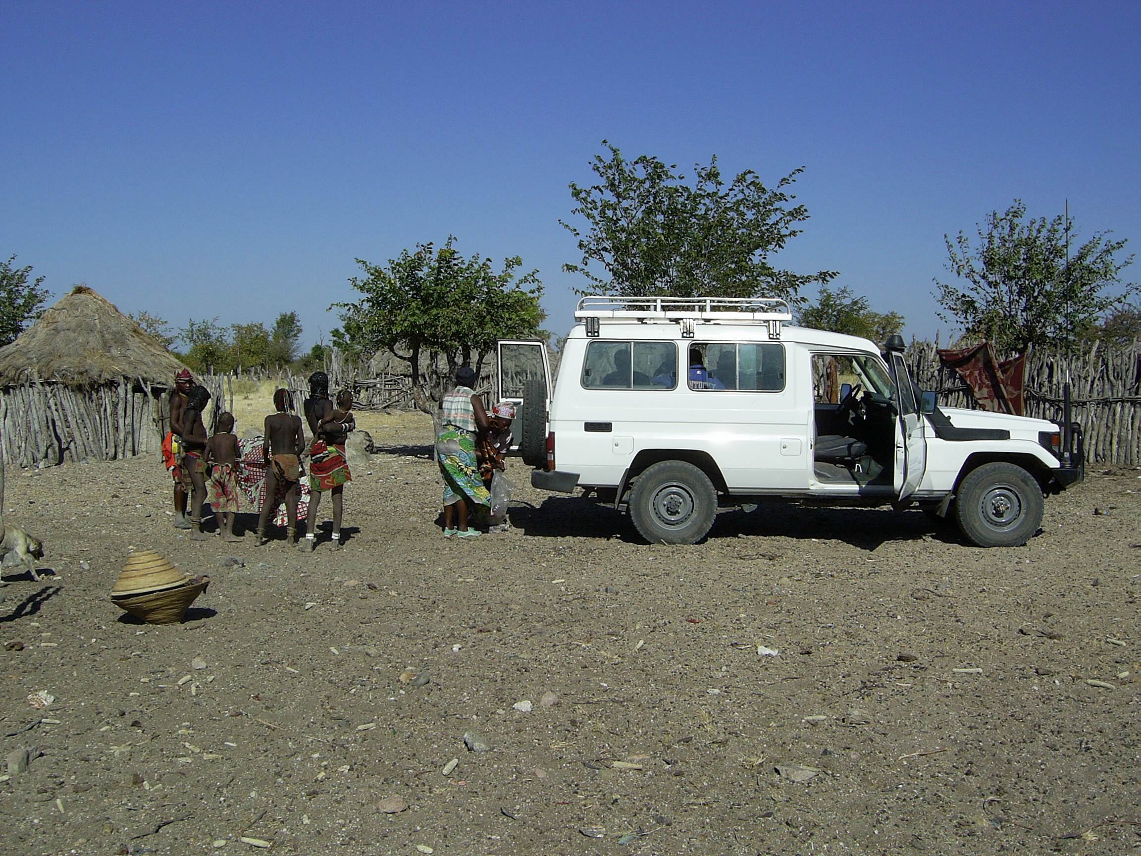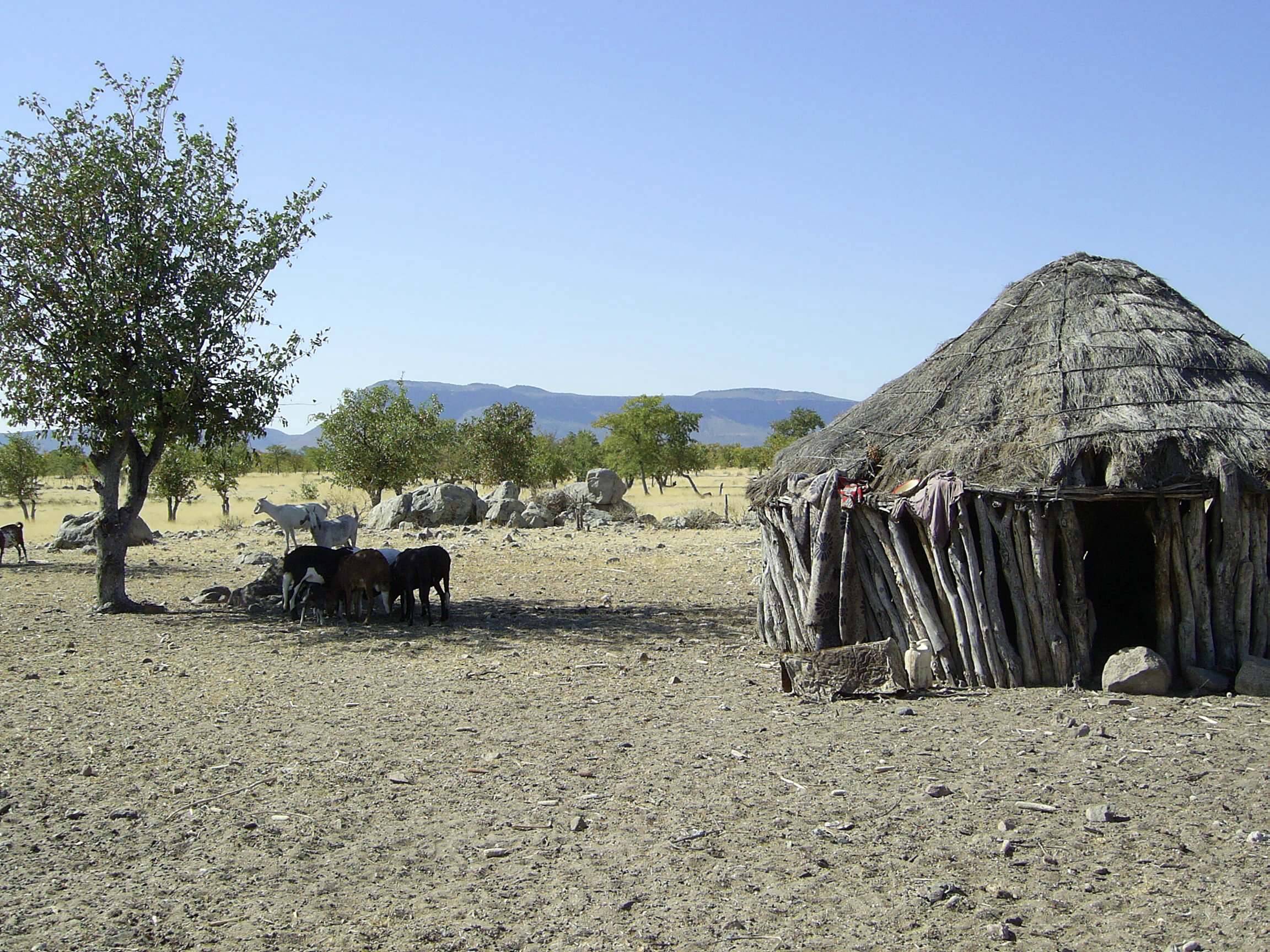 Ein Trampelpfad am Ortsende führt uns zur Straße nach Corocua. Diesen Weg kannte ich bisher nicht und ich bin erstaunt, sogar so etwas wie eine Straße erkennen zu glauben. Eigentlich ist es nur eine Geröllpiste ins Nichts. Aber zum Glück habe ich ja meine ortskundigen Navis dabei, wenn auch mitunter Diskussionen aufflammen, ob nun nach rechts oder links abgebogen werden soll. In diesem Fall halte ich erst einmal an und warte das Ergebnis ab. Joan hat mir eine Kassette von den Beack Street Boys geschenkt, die ich als mein Heiligtum betrachte, denn es ist die einzige, die ich habe und die mich an vertraute Klänge erinnert. Jede Fahrt muss sie im Fahrzeug herhalten, gefühlte eintausend Mal. Inzwischen hat man sich geeinigt und es geht weiter. Die Landschaft ist schön. Sie wechselt von flachen Ebenen mit steppiger Begrasung bis hin zur bergigen Felslandschaft, bewachsen mit Bäumen und großen Sträuchern. Nach gut einer Stunde kommen wir zu einem kleinen Dorf. Es sind ein paar Jangos, Rundhütten, in der eine Großfamilie wohnt. Vielleicht 20 bis 30 Einwohner. Sie züchten ein paar Ziegen, trotzen diesem steinigen Boden ein paar Pflanzen ab und verkaufen eine Grasart, die man mit unserem Schilf vergleichen kann und die für das Eindecken der Dächer von Rundhütten dient. Sehr begehrt ist diese Grasart bei den Lodges und edlen Herbergen in größeren Städten, die ihre Gäste gern in typische Unterkünfte einquartieren.