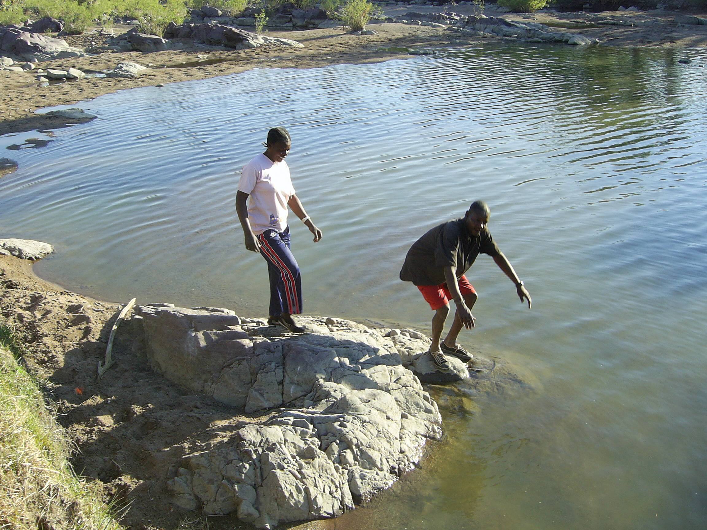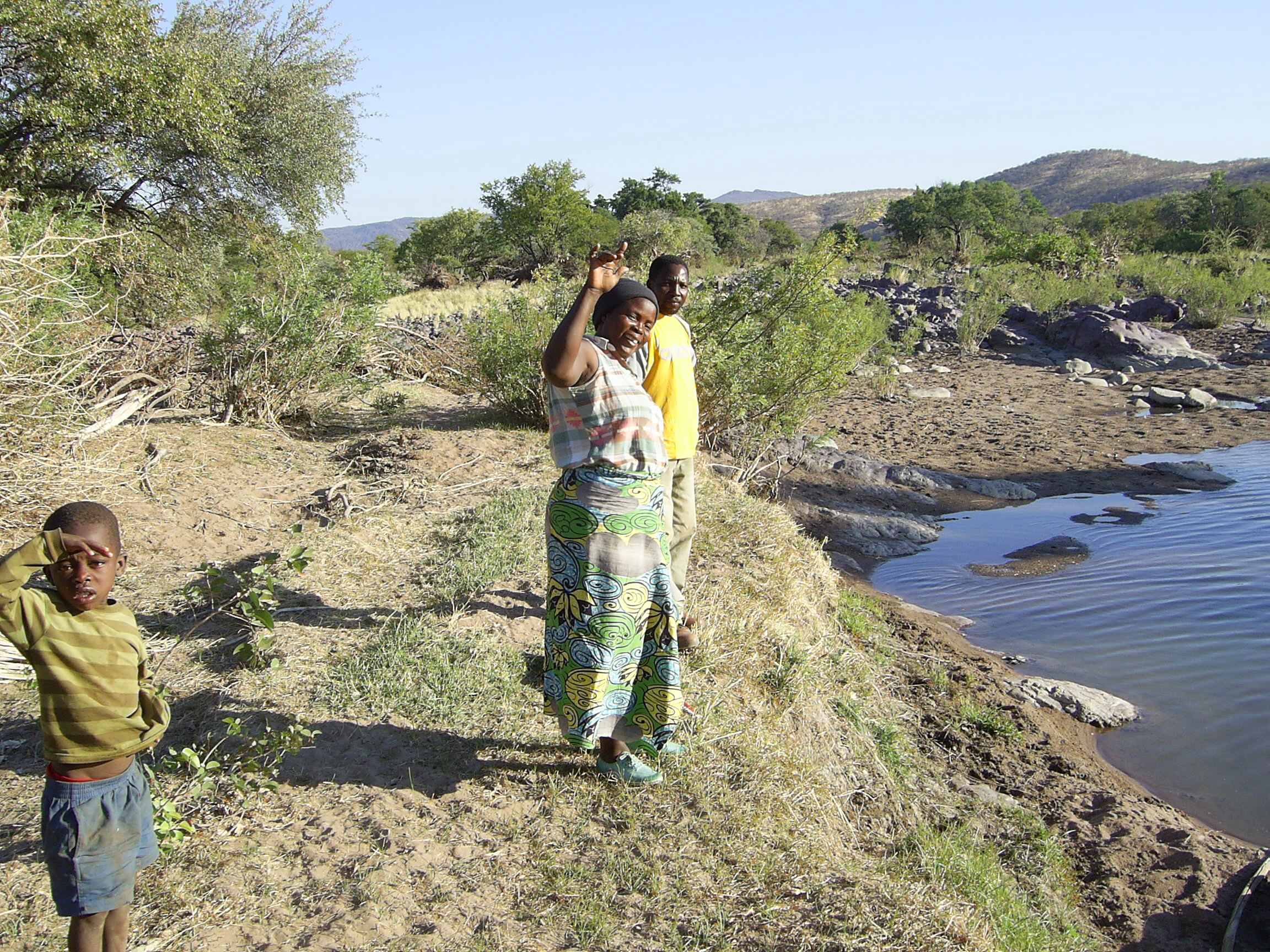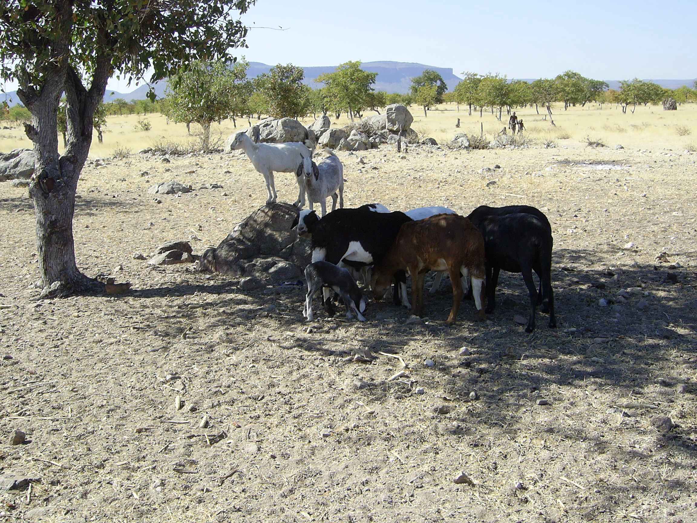 Ein Trampelpfad am Ortsende führt uns zur Straße nach Corocua. Diesen Weg kannte ich bisher nicht und ich bin erstaunt, sogar so etwas wie eine Straße erkennen zu glauben. Eigentlich ist es nur eine Geröllpiste ins Nichts. Aber zum Glück habe ich ja meine ortskundigen Navis dabei, wenn auch mitunter Diskussionen aufflammen, ob nun nach rechts oder links abgebogen werden soll. In diesem Fall halte ich erst einmal an und warte das Ergebnis ab. Joan hat mir eine Kassette von den Beack Street Boys geschenkt, die ich als mein Heiligtum betrachte, denn es ist die einzige, die ich habe und die mich an vertraute Klänge erinnert. Jede Fahrt muss sie im Fahrzeug herhalten, gefühlte eintausend Mal. Inzwischen hat man sich geeinigt und es geht weiter. Die Landschaft ist schön. Sie wechselt von flachen Ebenen mit steppiger Begrasung bis hin zur bergigen Felslandschaft, bewachsen mit Bäumen und großen Sträuchern. Nach gut einer Stunde kommen wir zu einem kleinen Dorf. Es sind ein paar Jangos, Rundhütten, in der eine Großfamilie wohnt. Vielleicht 20 bis 30 Einwohner. Sie züchten ein paar Ziegen, trotzen diesem steinigen Boden ein paar Pflanzen ab und verkaufen eine Grasart, die man mit unserem Schilf vergleichen kann und die für das Eindecken der Dächer von Rundhütten dient. Sehr begehrt ist diese Grasart bei den Lodges und edlen Herbergen in größeren Städten, die ihre Gäste gern in typische Unterkünfte einquartieren.