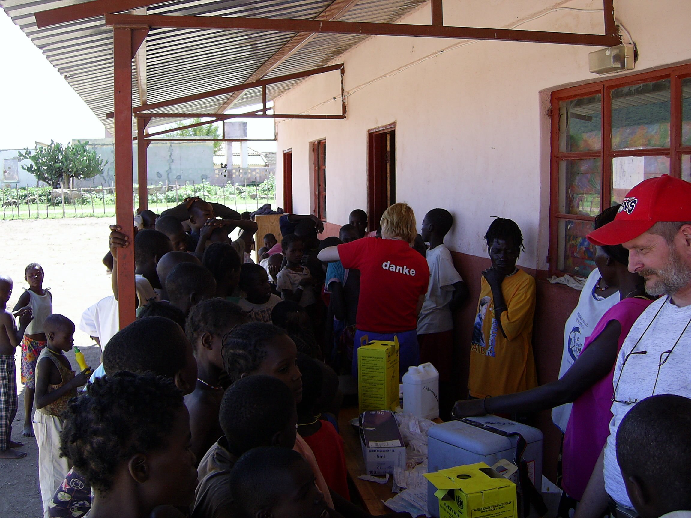 In der Lare werden wir schon von einer neugierigen Kinderschaar erwartet und empfangen. Mir schießt gleich durch den Kopf, als ich die freudigen Gesichter sehe, ihr armen Kleinen habt ja keine Ahnung, was Euch Schlimmes erwartet. Aber ich sollte mich täuschen. Der Direktor bezieht Stellung an einem Tisch, und alle Kinder stellen sich zur Impfung an. Jeder Name und die Impfung werden gründlich aufgeschrieben. Wir haben zu einer langen Tafel eingeladen, die all die vielen Pieksnadeln samt Ampullen aufbietet. Skeptisch und doch erstaunt sehe ich Kinder, die ohne eine Miene zu verziehen, tapfer diese Impfung angehen, für viele das erste Mal. Natürlich gibt es auch einige Verweigerer, aber Gesundheit ist wichtiger. Die Großen schnappen sich dann die Kleinen und schwupps ist die Sache erledigt. Nach fast 20 Jahren Bürgerkrieg ist Angola sehr bemüht, ein Bildungs- und Gesundheitswesen aufzubauen, was ich selbst jeden Tag miterleben darf. Der Weg ist steinig und schwer, aber man spürt regelrecht diese große Entwicklung. Einige von uns sehen vieles nur aus ihrer Sicht, ohne sich die Mühe zu geben, diese Menschen auch verstehen zu wollen oder zu können.