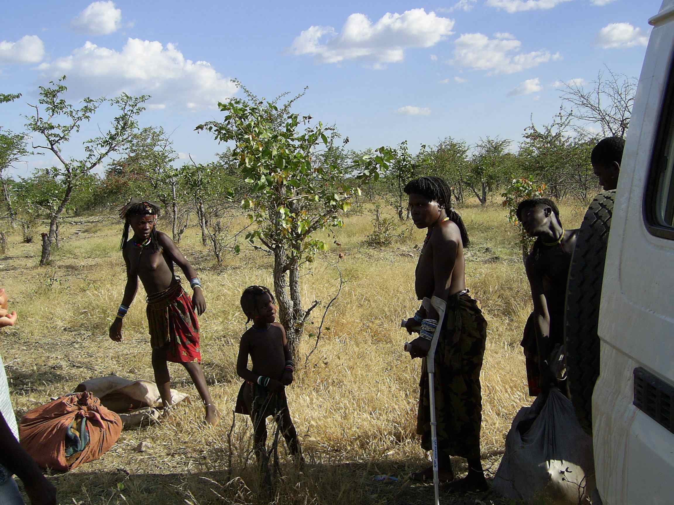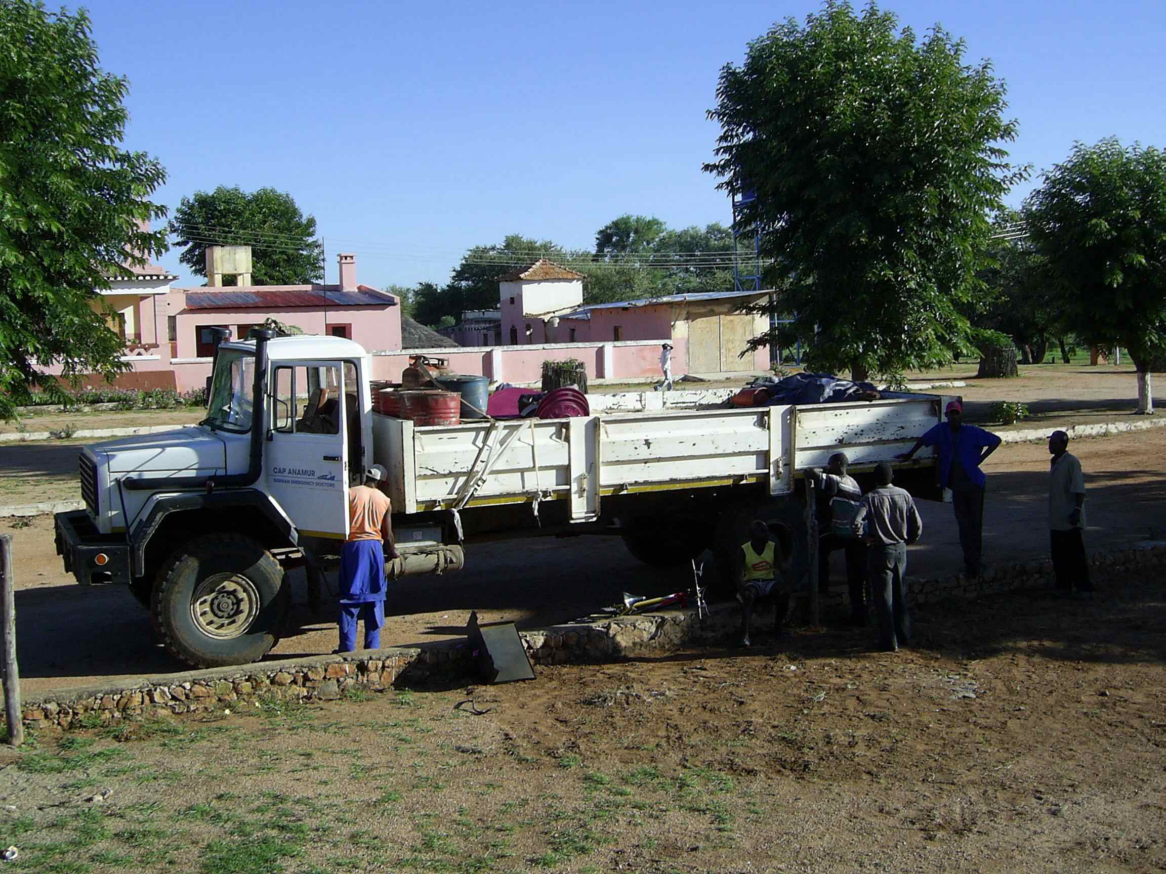Die nächsten 70 Kilometer nach Ondjiva haben wir nun vor uns. Jetzt haben wir aber endlich eine Straße. Leider hat die letzte Regenzeit es nicht so gut mit dieser Straße gemeint. Eine Fahrt, die durch Schlaglöcher gekennzeichnet ist (Schlagkrater wäre angebrachter zu sagen) und das mit diesem Monstrum von Lkw. Etwas Sorge macht uns eine Patientin aus Oncocua bei dieser Fahrt. Sie ist von einem Baum gefallen, das kann ja schon mal vorkommen, und da wir keine Möglichkeit haben, in Oncocua zu behandeln, ist das Krankenhaus in Ondjiva unsere große Hoffnung. Und dann diese Fahrt im Monster-Lkw mit einer gebrochenen Hüfte. Natürlich sind auch zwei Familienmitglieder mitgefahren, die die Frau im Krankenhaus versorgen werden. Spontan haben Ulrike und ich unser eigenes Geld zusammengelegt und der Familie gegeben, damit sie dort die Tochter verpflegen kann. Sie sind Traditionelle und haben keinerlei finanzielle Möglichkeiten, bis auf ein paar Ziegen als Kapitalanlage. Die gute Nachricht ist aber, wir haben sie einen Monat später wieder abgeholt, wenn auch mit einer Krücke, aber auf dem Weg der Genesung...